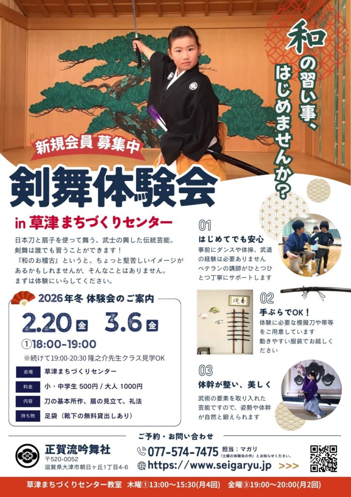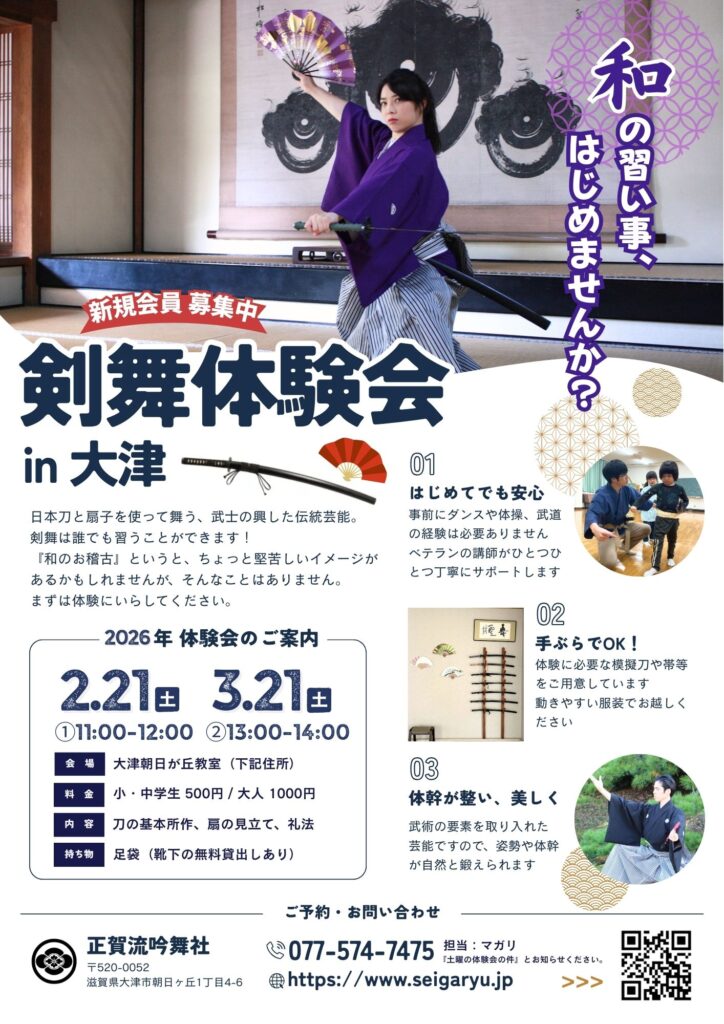 この度、剣舞の世界を気軽にご体験いただけるよう、滋賀県内の2会場(大津市・草津市)にて「剣舞体験会」を開催いたします。